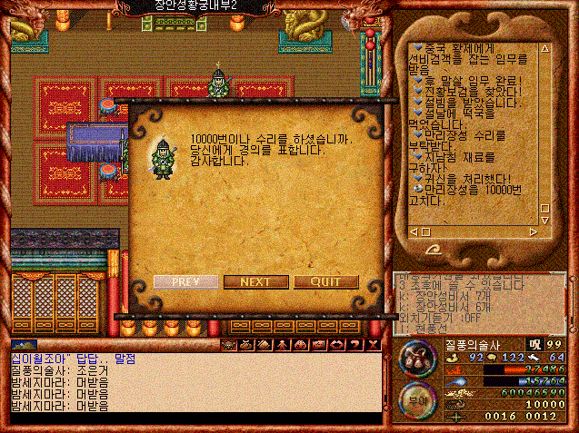 중국맵이 처음나왔을때 중국대륙으로 가려는 사람들의 인파 ㅋㅋ 아직도 기억한다 ㅋㅋㅋ 저 만리장성 벽돌퀘라고 만리장성을 수리하는 퀘스트가 있었다 ㅋㅋ 벽돌을 사다가 말을타고 만리장성을 돌아다니다보면 랜덤으로 부셔진 곳이 발견돼 수리를 하곤 했다 ㅋㅋ 아마 10000개를 수리하면 천풍선을 줬던걸로 기억한다.