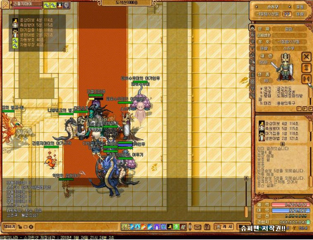 용궁이 패치되고나서 한동안 용궁에서 살았던 것 같다. 가장 생생히 기억나는건 저 복어장군 잡을때... 자꾸 옴마니 반메홈!! 이렇게 여유롭게 말하는데 더럽게 안죽었던 것 같다. 한때 여기서 나온 용왕의 투구, 용왕의 반지가 기본 사냥템으로 자리잡곤 했다.