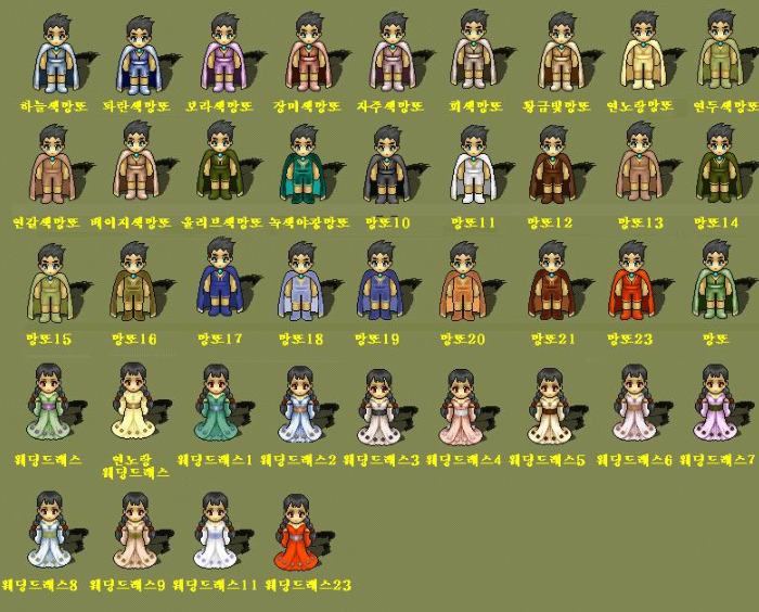 저렇게 많은 망또중에 아직도 가장 기억에 남는건 기본 망또... 아마 가격이 1.5만전이었던걸로 기억한다. 도토리를 200개 팔면 1000원을 줬나..? 그걸 15번 반복해 도토리 3000개를 모아 1.5만원짜리 망또를 샀는데 ... 분명 내캐릭의 모습은 남자였으나 성별이 여자였다... 그래서 그렇게 힘들게 모아서 산 망또를 못껴 눈물을 흘렸다...당시 내 나이 초 1...