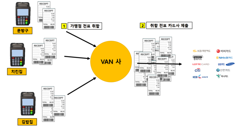 그런데 모든 가맹점, 즉 김밥나라던, 치킨집이던, 학원이던 카드결제를 사용하는 모든 사람들이 주마다, 월마다 카드사를 방문해야하면 당연히 아주 번거로울 것이다. 아니 물건팔기도 바쁜데 시간내서 카드사방문해서 저 영수증 뭉텅이 주고 줄도서고 하면 아주 개판이 되니까, VAN사라는 친구가 저걸 중간에서 대행해주는거다.
