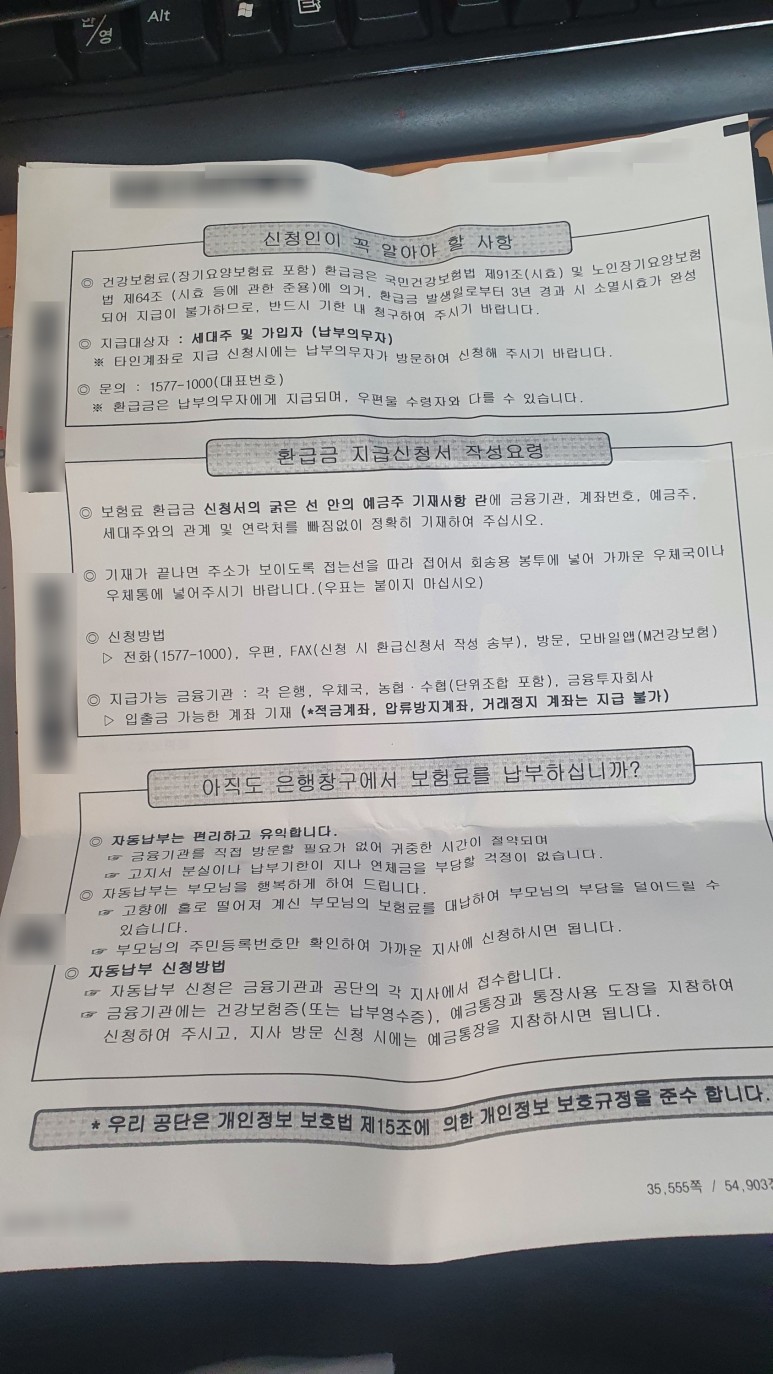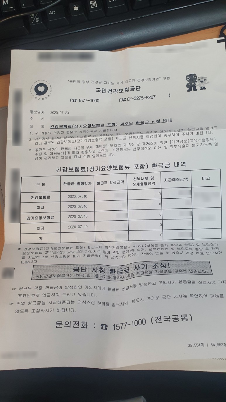 요약하자면 이렇다. 이중으로 납부했고, 환급받으려면 최소 3년 이내에 신청해야 받을수 있다. 신청방법은 같이 보낸 신청서 양식에 성명, 계좌정보를 쓰고 우편으로 붙이란다. ㅡㅡ...아니 지금 2020년에 PC방 결제도 자리에 앉아서 카카오페이로 결제하는 세상인데... 세상에... 환급신청하려면 문서작성을 해서 우편으로 붙이라고!!?? 본인들이 한번 더내라고 우편 보내놓고.. 왜 내가 시간내서 우편함까지 가야하는지 ㅡㅡ 도저히 이해가 안갔다.