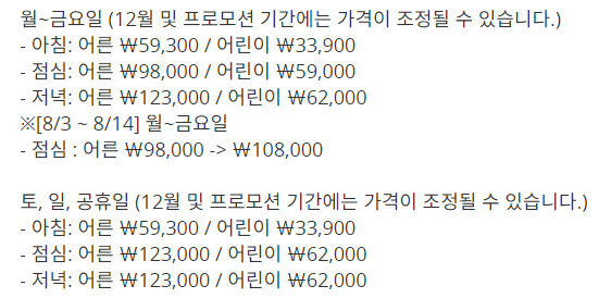 평일, 주말 동일하게 성인 1인기준 디너 가격은 123,000원 이다.