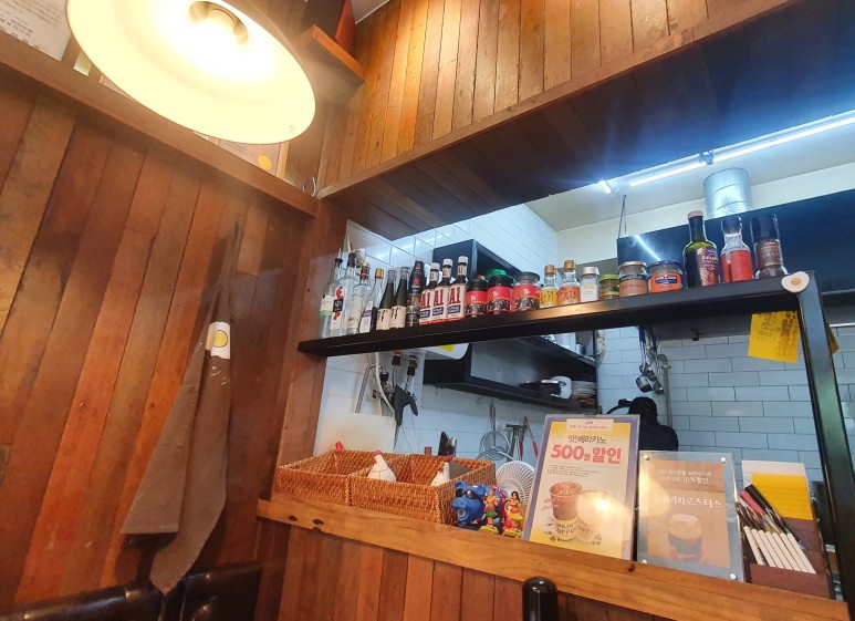 착석 성공! 바로 옆에 아기자기한 양념통들이 전시되어 있다. 그리고 여기 앞치마에 계란 하나 그려져 있는데 짱귀엽다.