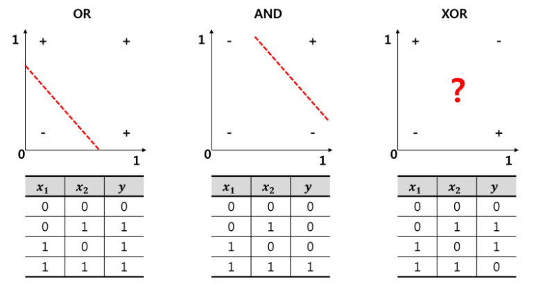 Looking at the graph of the left-most XOR gate, there was a problem in which the results of + and - could not be divided into one straight line (linear). If you look at the OR gate and the AND gate can distinguish between + and - with a single line, XOR is impossible!! So I wondered if the history of AI, which had been popular, would end like this, but Professor Marvin Minsky said, "We can solve it using multi-layer."