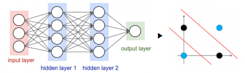 Using two layers (blue) instead of one-layer layers as shown above, it has been revealed that XOR results can be divided into two straight lines, as in the far right graph. However, at that time it was theoretically possible to model the above concept, but it was too complex to actually implement it. (You don't have to understand what the picture above is. I will study properly later on, so non-specialists just have to be aware that there is a model in shape.