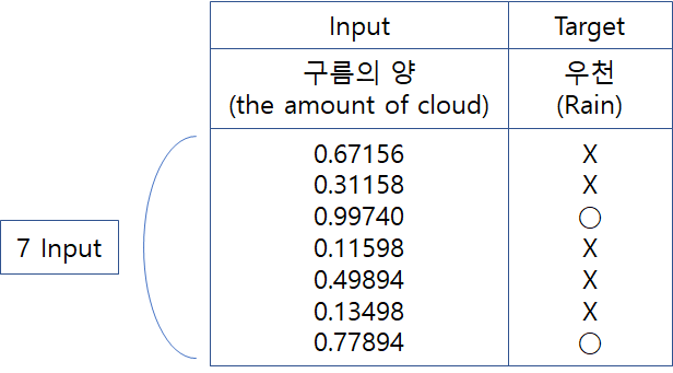 Map learning is literally human guiding programs if you understand them. In the example of the above data, the program gives past data on whether it actually rained, depending on the amount of clouds, which is called training data. We put in a total of 7 data, 67% of the cloud was not enough, 31% was not enough, 99% was raining. The program trains a total of seven data sequentially.