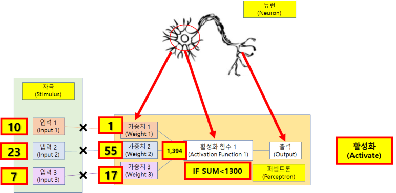 자. 첫번째 가지돌기에 10이란 입력신호가 들어왔고 가중치가 1이니 총합이 10이다, 두 번째 가지돌기도 같은방식으로 23x55를 하면 1265라는 수치가 나온다. 세번째 가지돌기도 같은방식으로 7x17을 하면 119라는 값이 나온다. 그럼 이 세 가지돌기에서 가중치를 고려해 모든 자극의 합을 보면 10+1265+119 = 1394라는 값이 나온다. 해당 퍼셉트론이 입력을 통해 받아들인 가중치를 고려한 입력들의 합은 총 1394라는 것이다. 저기서 활성화 함수를 보면 조건이 IF = 만일 / SUM<1300 = 총합이 1300보다 크면이라는 조건이 있다. 현재 총합이 1394이기 때문에 해당 조건을 만족하니 출력이 Activate 되는 것이다.