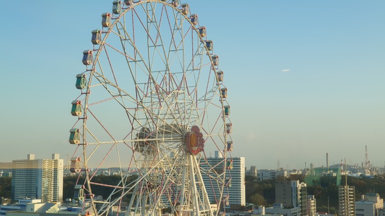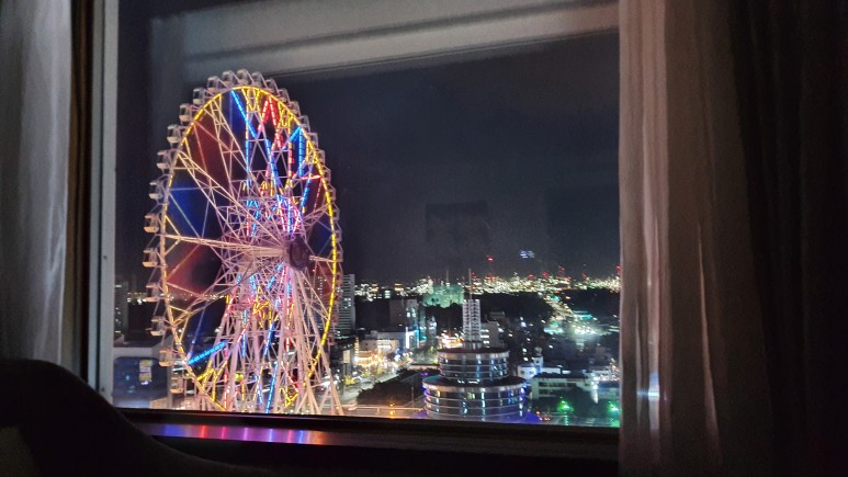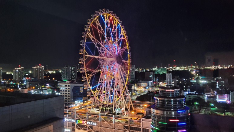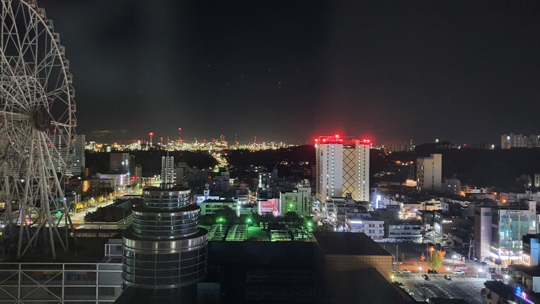 오 이게 그 울산 랜드마크인 대관람차..! 롯데 영프라자 옥상에 있었다고 한다. 울산에서 일하는 친구한테 물어보니 저거 타봤다고 한다 ㅋㅋㅋ 광각으로 찍어서 엄청 멀어보이는데 창문 바로앞에 있었다.