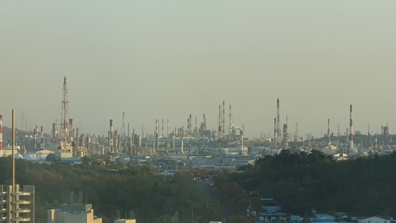 이건 저~~~멀리 보이는 울산공단. 카메라에선 지저분하게 나왔지만, 실제 육안으로 봤을땐 소름과함께 인류문명에대한 경외감이 느껴졋다. 어릴때 보았던 반지의 제왕에서 사우론이 이끄는 군단의 심장을 보는 것 같았다. 나처럼 기계를 좋아하는 사람들이 보면 좋을 뷰였다. 카메라로 못담은게 아쉬울뿐...