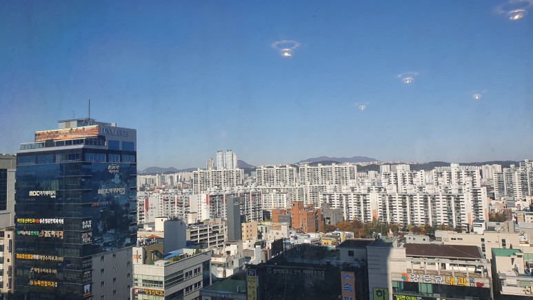 호텔 엘레베이터쪽에서 찍은 울산 시내쪽 모습, 2000년대 초반 스타일의 아파트들이 많이 있다.