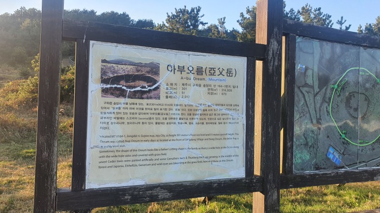 세월이 느껴지는.. 안내판.. 교체가 시급하다.. ㅋㅋ 아 그리고 여기 네비찍고 올때.. 아부오름이라고 안나오는 곳도 있다. 보니까.. 앞오름. 아부오름 뭐 이렇게 부르더라