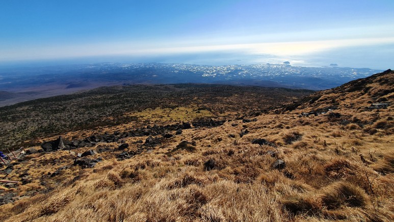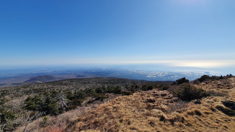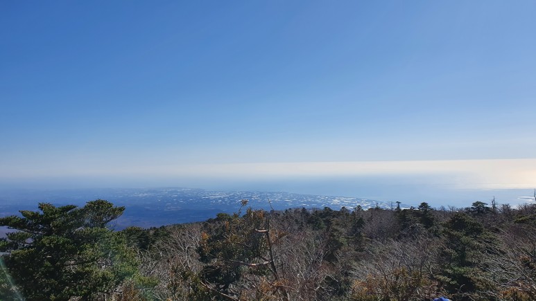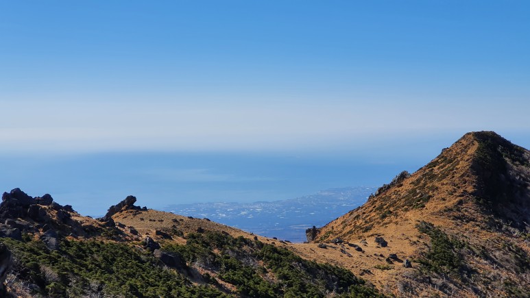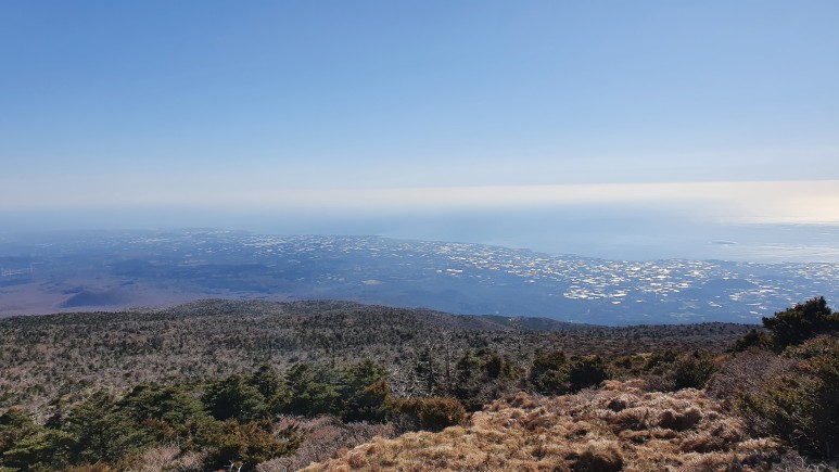 백록담 너머로 보이는 곽지, 애월쪽이 보인다. 날씨가 너무 좋다.