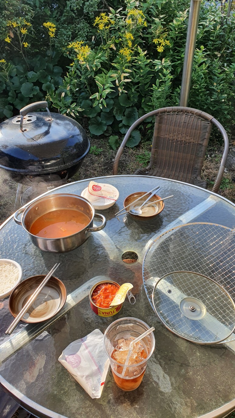 아침에는 간단하게 조리할 수 있는 부대찌개를 사서 고추참치와 햇반을 해서 먹었다. 뭐 괜찮았다. 정원에서 먹어서 더 좋기도 했던거같고