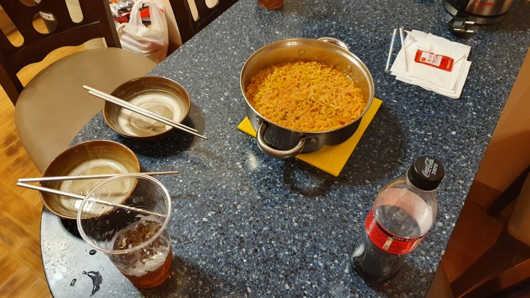 저녁 야식은 라면을 먹었다. 2갠가 3개를 끓였는데 다 먹었다.