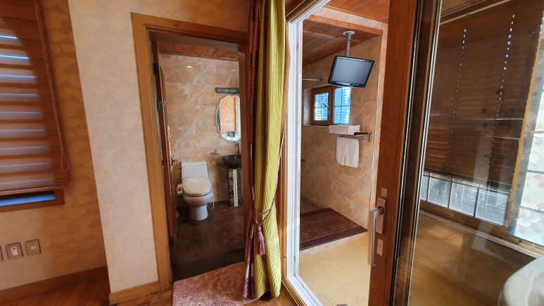 그리고 화장실이 아주 넓다 깊숙히에 변기와 세면대가 있고 우측에는 스파시설이 있다. ㅋㅋㅋ 잘보면 천장에 모니터도 달려있어서 TV도 나온다. 하지만 모니터가 좀 오래되서 화질이 좋지는 않다.
