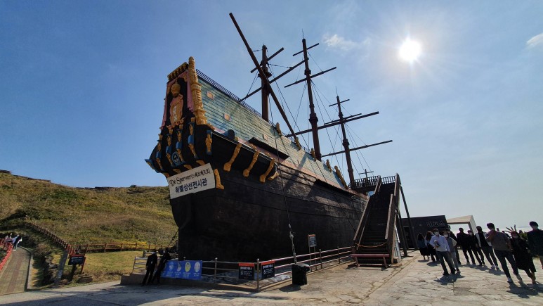 한 5분 걸으면 용머리해안 입구에 다다른다. 여기에는 하멜상선전시관이 있다. 맞다 우리가 아는 하멜표류기에 나오는 그 동인도회사 소속의 하멜씨가 맞다. 약 350여년 전에 이 제주도 근방에서 포류하다 발견되었다. 저 상선은 실제 크기의 85%의 축소모델이며 무려 20억짜리라고 한다.