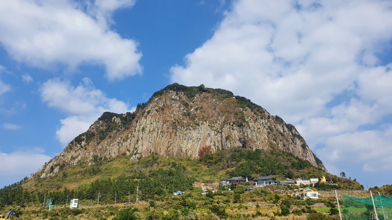 주차장 뒤편으로 산방산이 훤하게 보인다.
