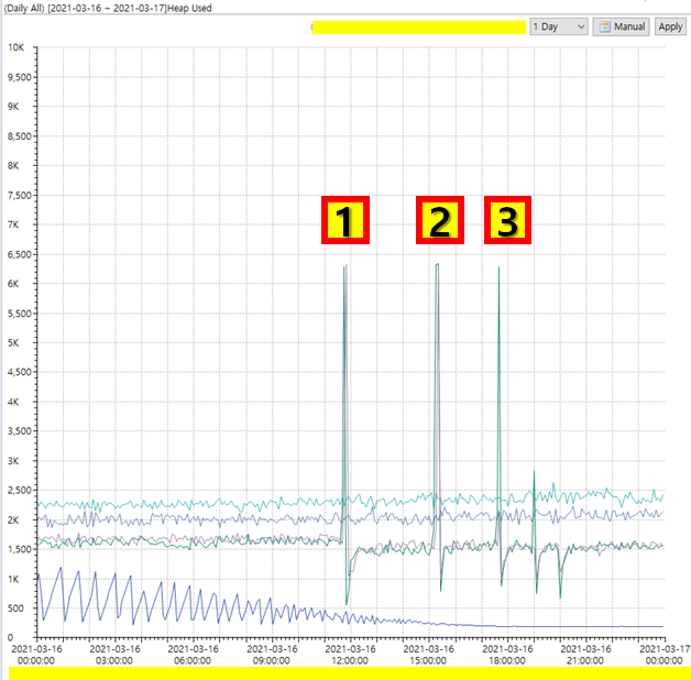하지만 위 사진을 보다시피 3월 16일동안 3회나 01번 02번 WAS 힙메모리 점유율이 급격하게 올라가는 것을 볼 수 있다.