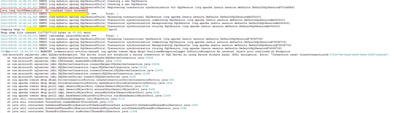 보통 지연이 길거나, 부하가 강한 요청 중 단순 조회작업이라면 Kill을 해서 일단 서비스 복구를 하고 분석을 할텐데.. 이건뭐 톰캣이 다 죽어있으니 뭘 할수도 없고 ㅋㅋ당장 서비스 복구를 위해 WAS 재부팅밖에 답이 없었다. 그리고 바로 WAS 로그를 확인해봤다.