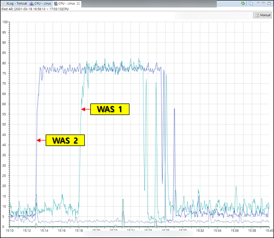 문제가 최초 발생 했을 시간대의 CPU사용량을 보니 WAS 2번이 기존 5~10% 내외로 사용하던 사용량이 어느 시점에 80%까지 올라가며 최대 부하가 걸려있었다. 5분 뒤 WAS 1번도 따라서 같은 현상을 보이기 시작했다.