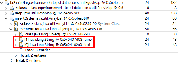 자 대충 <class> 객체는 크기가 얼마 안크니 무시하고 6.5GB나 차지하고 있는 elementData를 까보자. 위처럼 나올꺼다. 보니까 Element 하나가 EgovMap 자료형인 ArrayList인가 보네? 1번 박스에 있는 메모리주소를 한번 봐보자, Element 끼리의 메모리 주소 간격이 모두 1BO (Hex) 로 동일하다, 연속적으로 쭉 할당된 것이다.