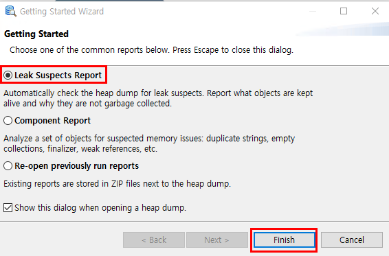 그럼 위 처럼 어떤 레포트 볼꺼냐? 물어보는데 디폴트로 선택된 누수 리포트(Leak Suspects Report)를 선택하고 Finish 해주자.