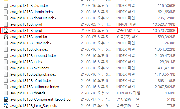 위 사진에 나온 다른 파일들은 MAT를 돌리고 생성된 파일이니 무시하면된다. 우린 java_pidxxxxx.hprof 파일만 있으면 된다.
