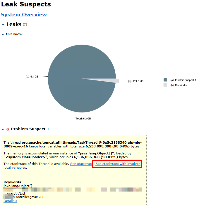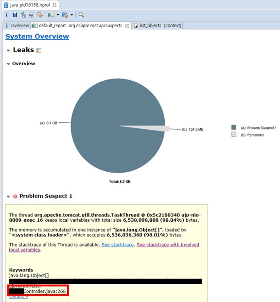 다시 돌아와서 3번 박스를 보자. 여기 아주 확실하게 2번에서 문제가된 java.lang.Object[] 이게 소스중 어느파일, 몇 번째 줄인지까지 알려준다. 검은색으로 가린건 소스노출이 있어 가렸고 맨 하단 xxxController.java:266 이라고 써져있듯이, 저부분을 처리하다 메모리 누수가 발생했다고 보면 된다.