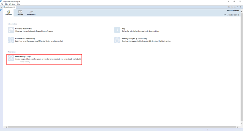 오우...실행 완료. 화면 하단에 보이는 Open a Heap Dump 버튼을 눌러서 아까 빼내온 java_pidxxxxx.hprof 파일을 열자.