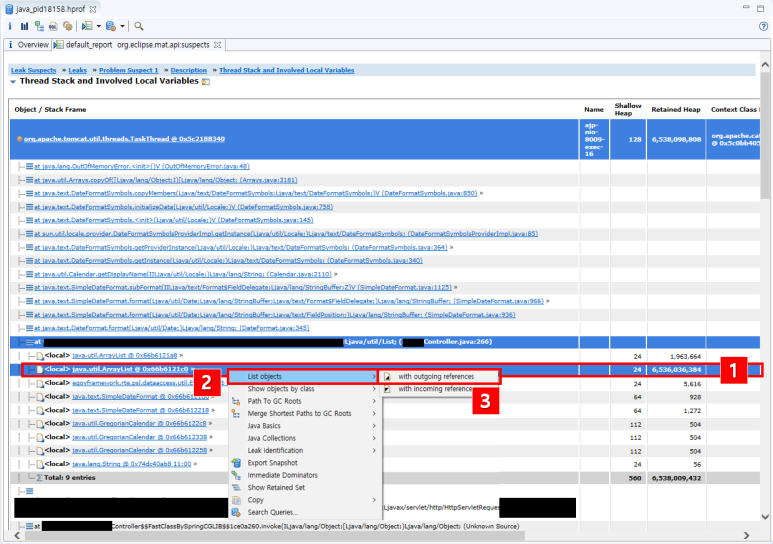 1번 박스를 보면 딱봐도 저 0x66b6121c0 주소에 할당된 객체가 6.5기가나 잡아먹고 있다는것이 보인다. 그 객체를 눌러서2번 박스처럼 List Object를 눌러주자, 오른쪽 마우스누르는게 아니다. 저 주소값 적혀있는 객체 이름을 눌러주자. 그뒤 3번에 있는 with outgoing references 버튼을 눌러주자.