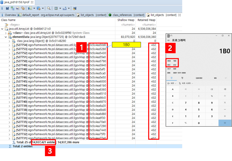 2번 계산기에서 1BO를 10진수로 바꾸면 432이고 역시 EgovMap 객체 하나당 Retained Heap 을 보면 동일하게 432를 차지하고 있다. 근데 이런게 14,937,421 개나 생성됐다는것..(3번 박스)