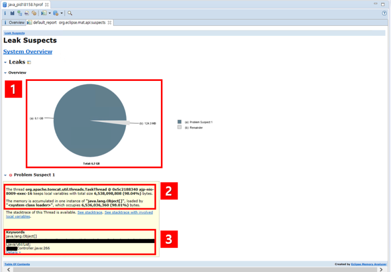 그럼 이런 화면이 나온다. 당시에 메모리에 적제되어있는 객체들을 뽑아준다. 우리가 봐야할껀 파랗게 표시된 부분이다. 자동으로 MAT가 의심가는 객체를 저렇게 파랗게 하이라이트 해준다.