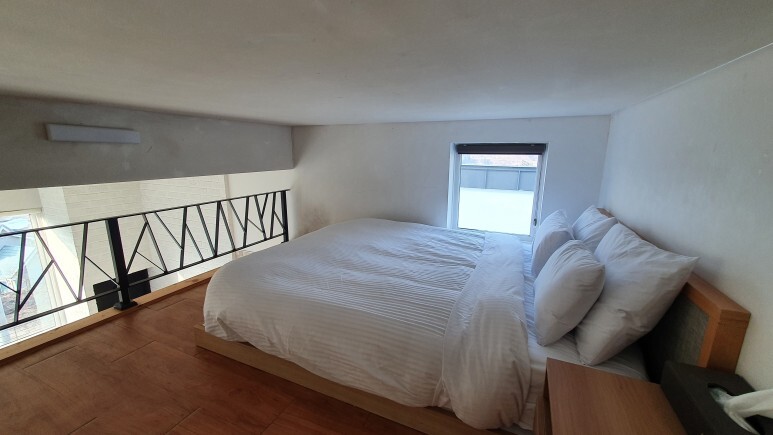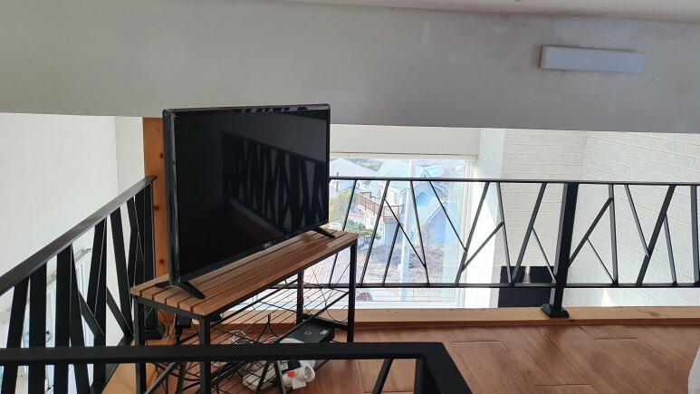 또 괜찮았던게 복층에도 TV가 있다는점. 나는 항상 복층 숙소를 보면 왜 TV를 아래두고 침대만 위에 올라와 있을까 이생각을 많이한다. TV는 1층에서 보다가 2층은 잠자러 갈꺼다 이건가..? 나는 침대에서 티비 보고 싶다고!! 항상 이말을 많이 했는데 여긴 이게 반영되어있어서 좋았다. 다만 아래 선정리는 아쉬웠다.