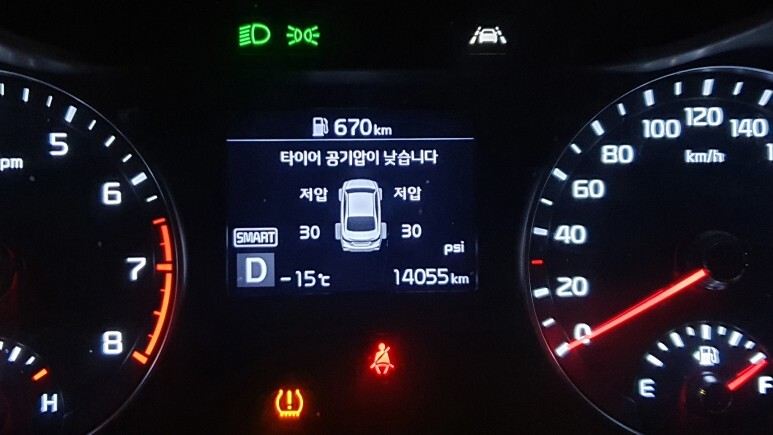 그도 그럴것이 이달이 꽤나 추웠다. 차량 온도센서로도 외부 영하 15도가 찍히는데 그냥걸어만 다녀도 체감온도 영하 20도였던 달... 그래서 공기가 수축해서 압력이 떨어졌나보다. 이건 추후에 기아 센터에서 바람 넣고 해결됐다.