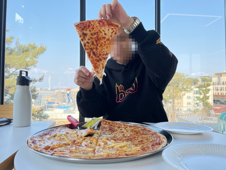 일단 피자 한조각 크기가 얼굴만하니 참고하길 바란다. 엄청 크다.. 글고 웃겼던게 ㅋㅋㅋ 여행하다 남은 제로콜라가 텀블러에 남아있었는데...가져와서 먹었다... 진상인가...ㅠ 뒤에 뷰가 보일텐데 맑을 때 오면 정말 뷰가 좋은 식당이다.