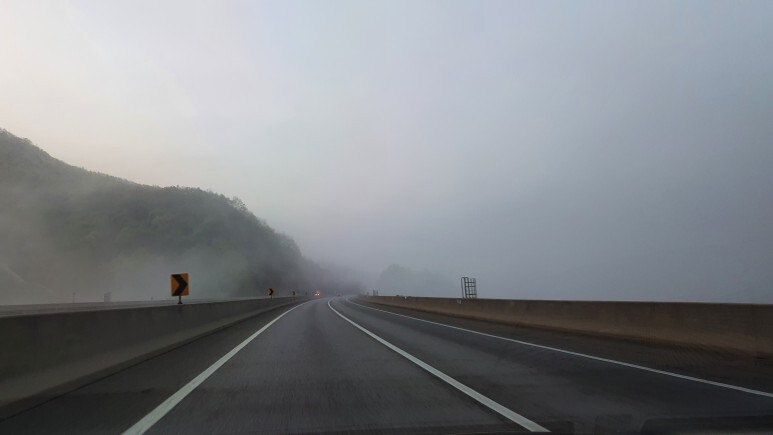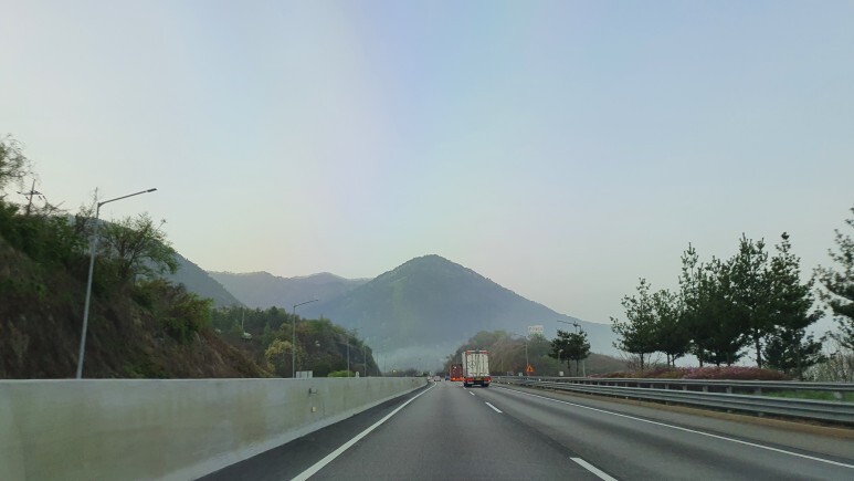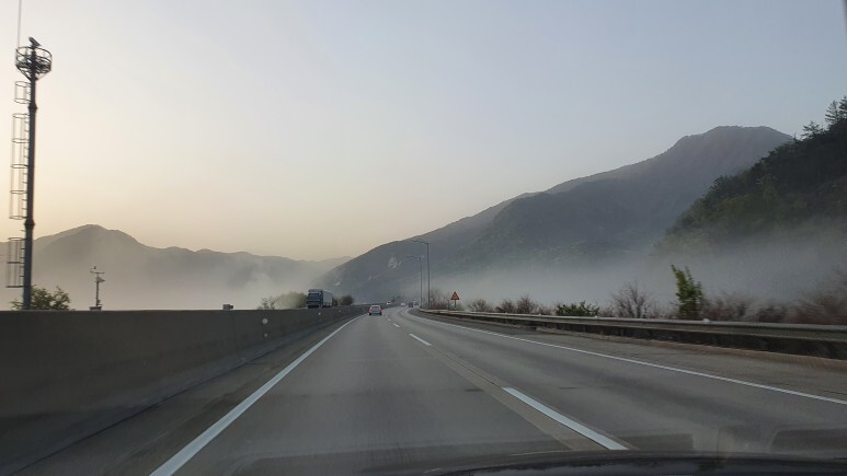 중부고속도로를 타고 가는 중~ 이때 한 06시이다. 약 한시간 반을 달려 충주 언저리를 지나갔다. 도로가 고지인지 주변에 안개가 스르륵 올라오고 있었다.