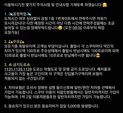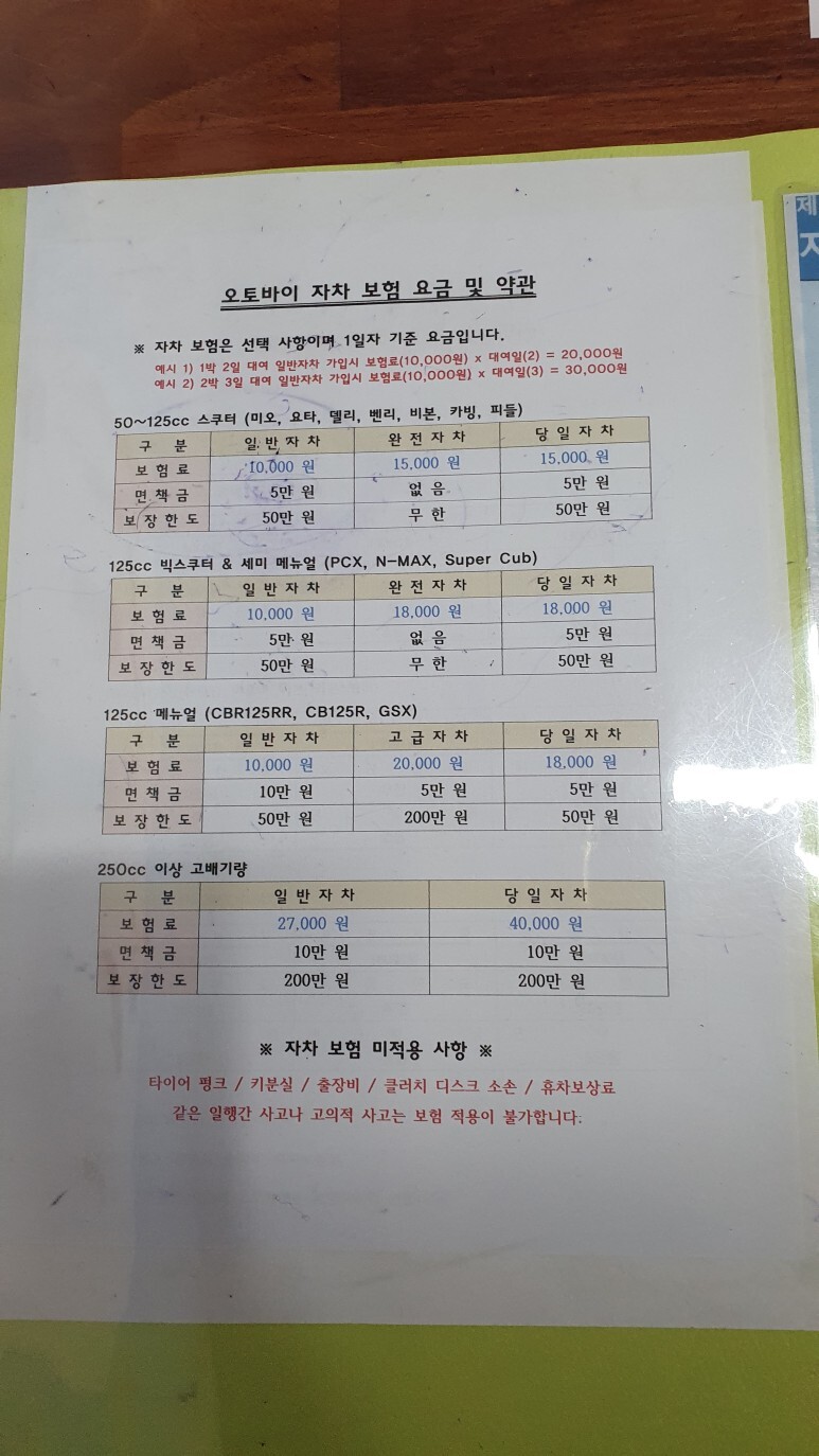 보험은 위와 같다. 나는 50cc짜리라서 하루 만원이 들었다. 완전자차를 하고싶었는데 초보자는 안된단다.... 보장한도 50만원이던데.... 내가 빌렸던 바이크 검색해보니가 새상품 280정도 하더라..전손나는 순간....돈이 백단위로 깨지겠구나 생각했다.