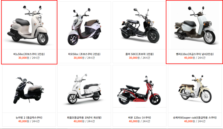 일단 내가 고민했던 건 비노, 미오, 줌머 50cc를 탈지.. 아니면 110cc 벤리를 탈지 너무 고민했다. 근데 벤리는 일 대여비가 1만원 더 비쌌다.