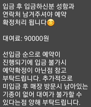 걍 예약하기 누르고 기종, 날짜 선택하면 끝이다, 결제까지는 안하고 예약 접수를 하면 영업일날 문자나 전화로 안내가 온다. 나는 회사있을때 전화를 받아서 문자로 달라고하니까 입금하면 예약확정이 된다는 것이었다. 대여비는 9만원 이었고 바로 9만원을 입금했다.