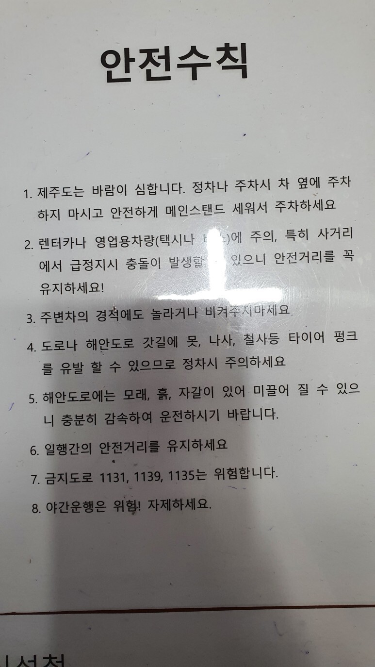 일단 도로 노면 잘 보면서 다녀라, 요철이나 도로 손상된 곳, 그리고 현무암 덩어리? 이런게 자주 널부러져있었다. 밟으면 위험하니 꼭 노면 보면서 운전해라. 특히 과속방지턱 까맣게 칠해져있는거 꽤나 있다 ㅋㅋㅋ 이거 조심하시길... 앞차 보면서 꿀렁이나 확인하면서 가자.