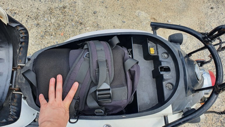 보통 주차해놓고 헬멧 걍 걸어두면 분실 할 위험이 있어 저기안에 헬멧을 넣어두면 된다. 그게 아니라면... 저기 의자 뒤에 지게같이 생긴곳이 있어서 약수터 물통 조이는 끈같은걸로 묶어둘 수 있다. 첨에 출발할때 가게에서 내 백팩을 저 뒤에 묶어두셨는지, 매 관광지마다 다시 풀고, 출발할 때 조이는 과정이 만만치 않았다.