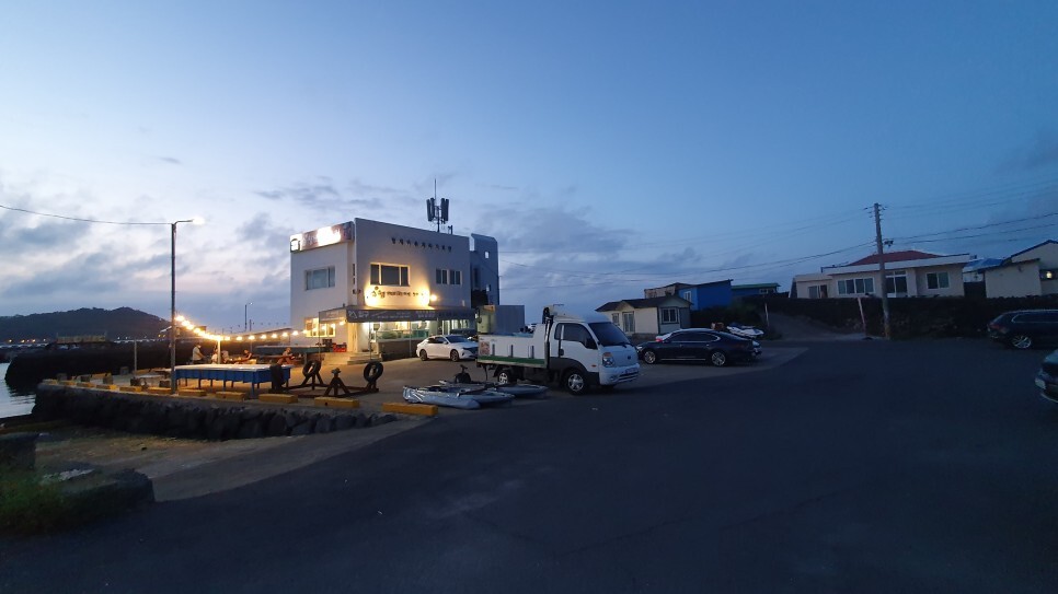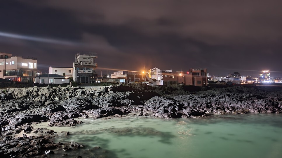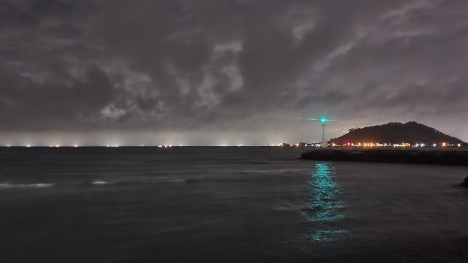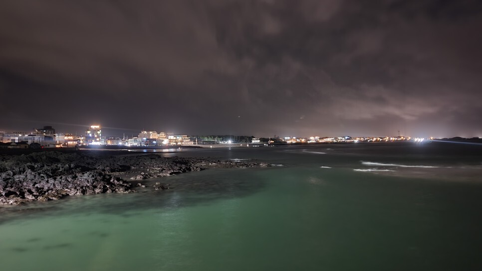 밤에 바라본 비양도쪽. 눈으로 볼땐 깜깜했는데. 노출 오래 여니까 형체정도 찍혔다.