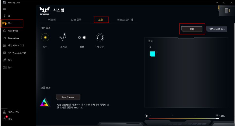 위 사진처럼 좌측부터 장치 > 조명 > 설정을 눌러 설정메뉴에 진입한다.