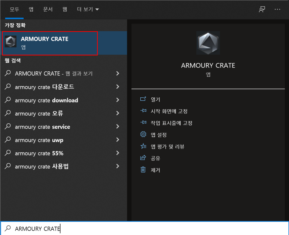 보통 아수스 게이밍 쓰는 사람들은 기본적으로 ARMOURY CRATE 앱이 설치되어있을 것이다. 이 앱은 키보드 조명을 관리해주는 친구다. 없다면 각 노트북 기종에 맞게 ASUS 홈페이지가서 따로 설치하면 된다.