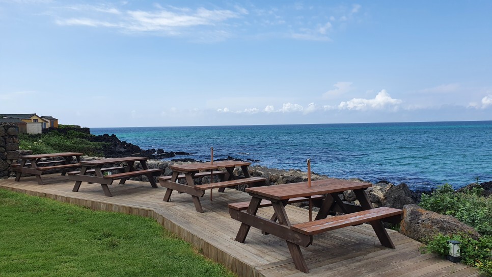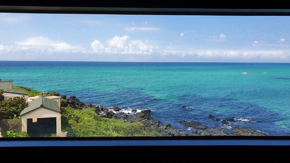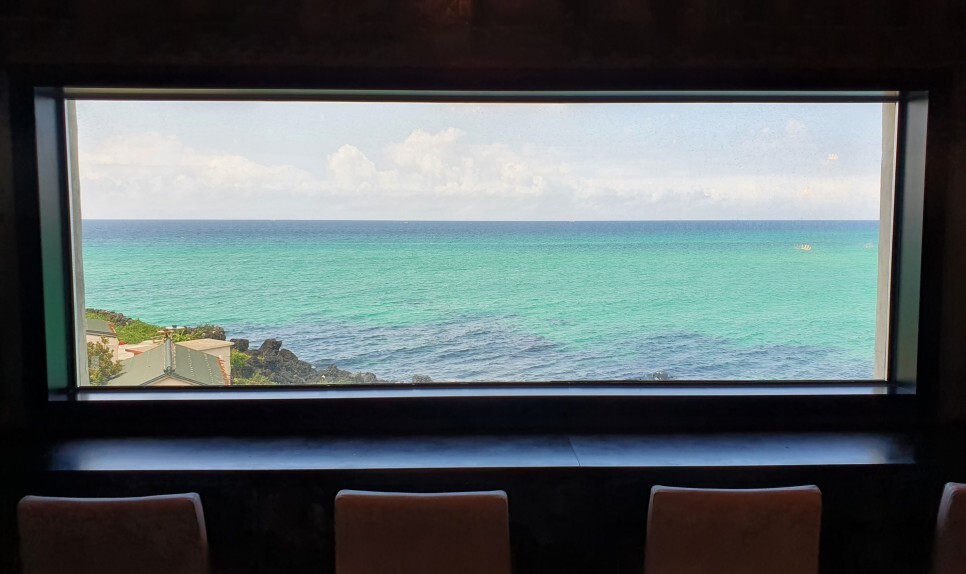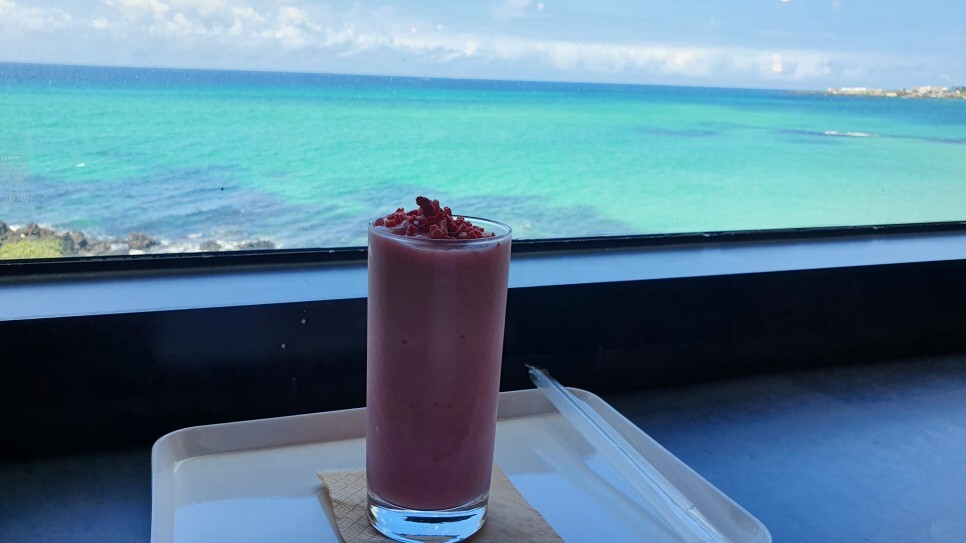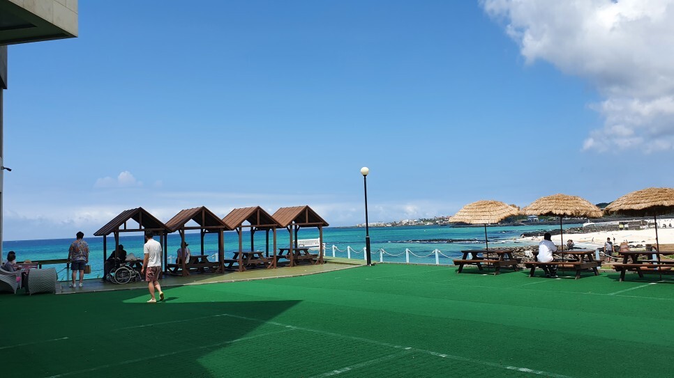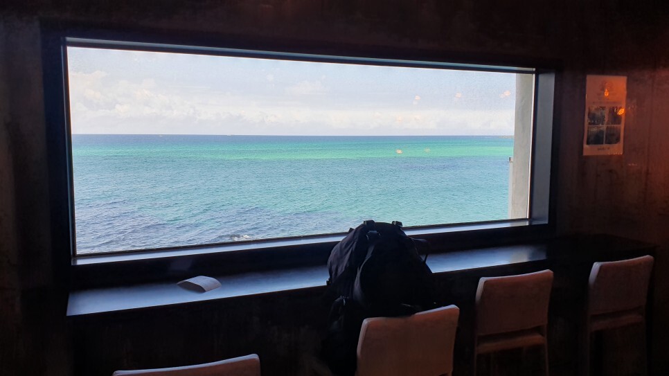 오키나와에서나 봤던 리얼 에메랄드 바다..! 이거 보면서 음료를 기다렸다.