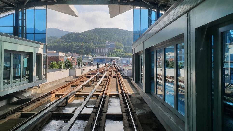 바깥으로 나오면 경전철 타는 곳이 있다. 저 보라색 경전철 타러 이동