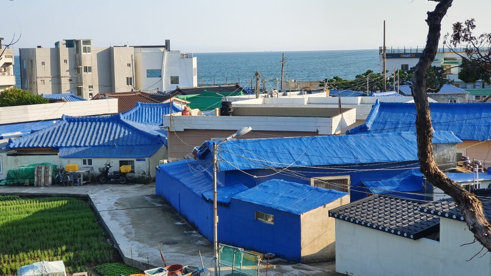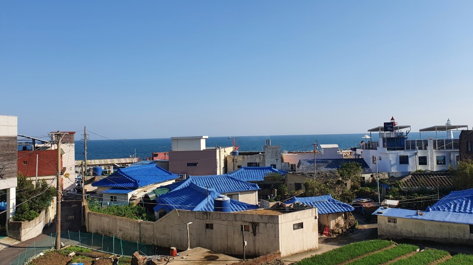 살짝 오묘한 파란색 지붕을 가진 집들이 있다.