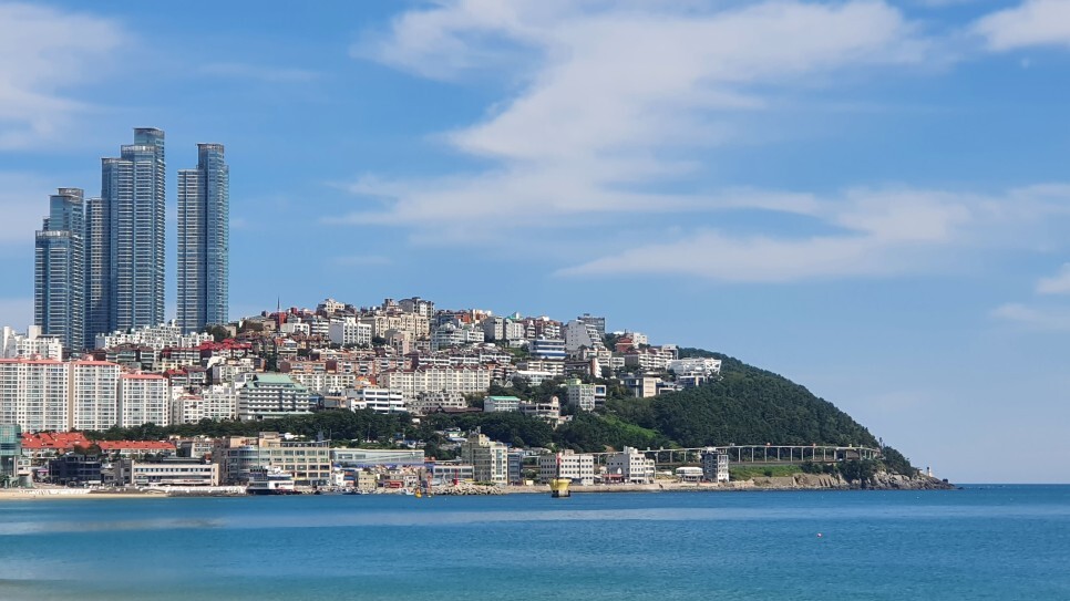 동백섬에서 바라본 해운대쪽 모습, 먼가 좌측 갈색건물이 안어울린다.