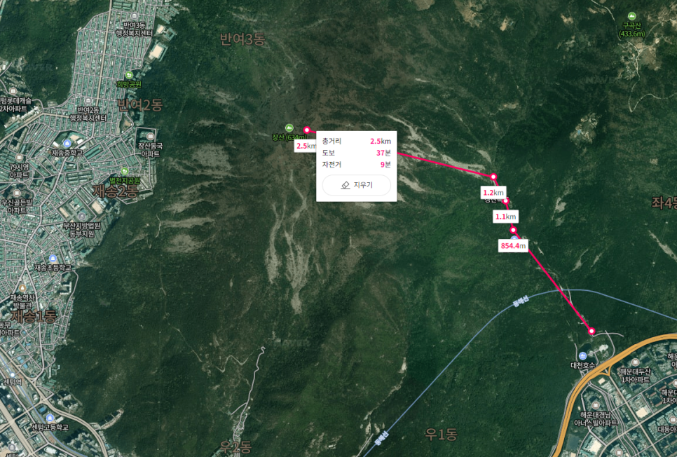 음.. 오래 하는건 별론데..하고 머.. 수직으로 짧고 굵게 올라가는 경로는 없을까? 하고 찾아보니 장산기준 서쪽에 있는 재송동에서 올라가는 길이 있는 것 같더라 직선거리는 약 900미터..! ㅋㅋㅋㅋㅋㅋㅋ그래! 이길이야 하고 바로 여길루 출발했다.