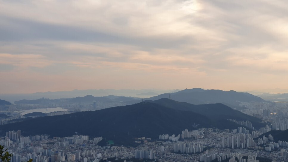 요건 부산 내륙방향이다. 금련산과 황령산이 보인다. 확대해보면 황령산 봉수대갈때 보이는 송출타워가 보인다.
